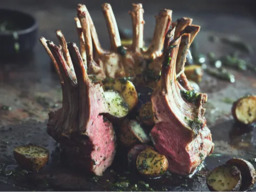 Gevulde lamskroon met een deeg van lamsgehakt (olijven, zontomaatjes en fetakaas. Deze lamskroon is een ware Eye catcher op tafel. genoeg voor 4-8 personen.